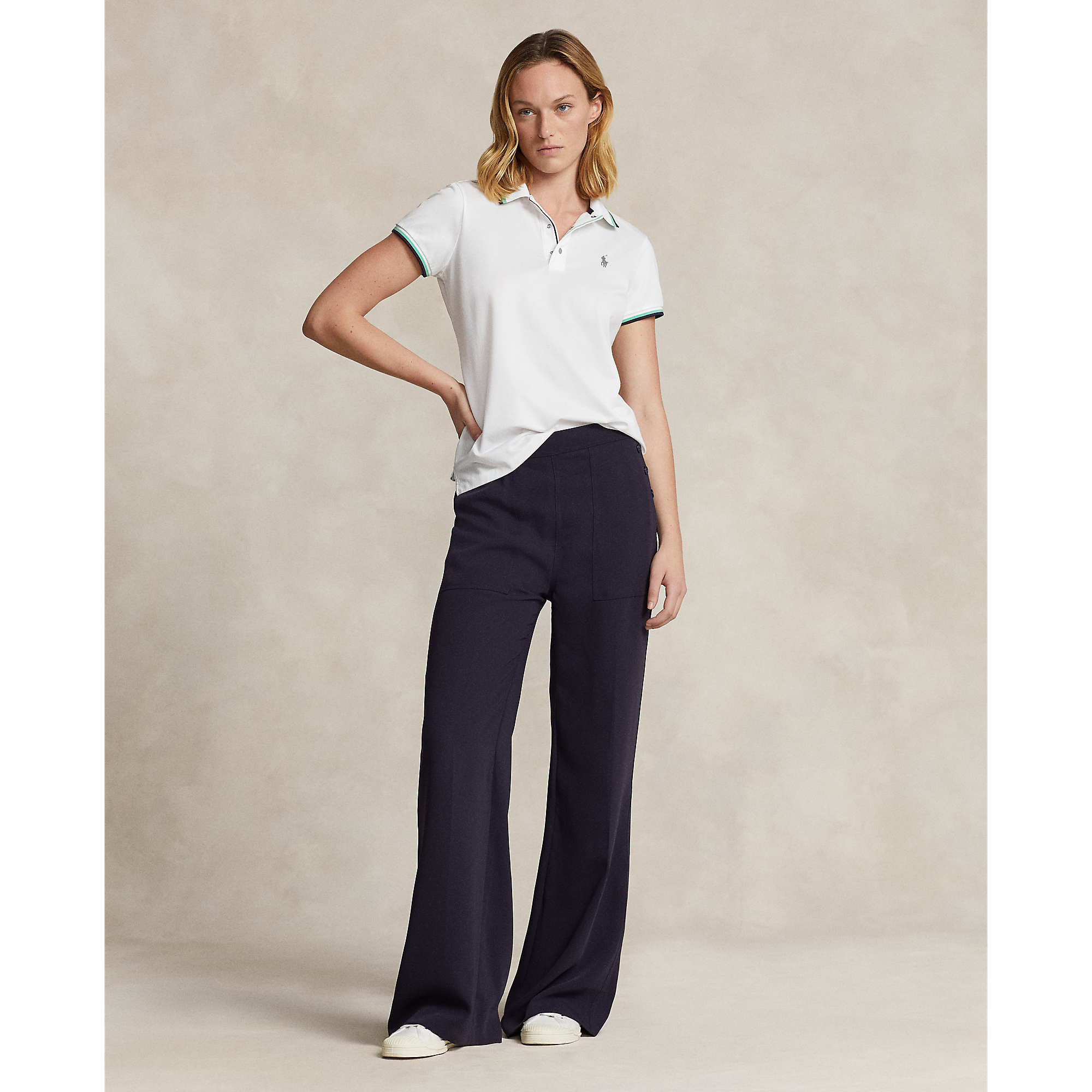 Cocokkan detail warna di pita kerah dan lengan kembali ke celana baru Anda atau skort dari Ralph Lauren