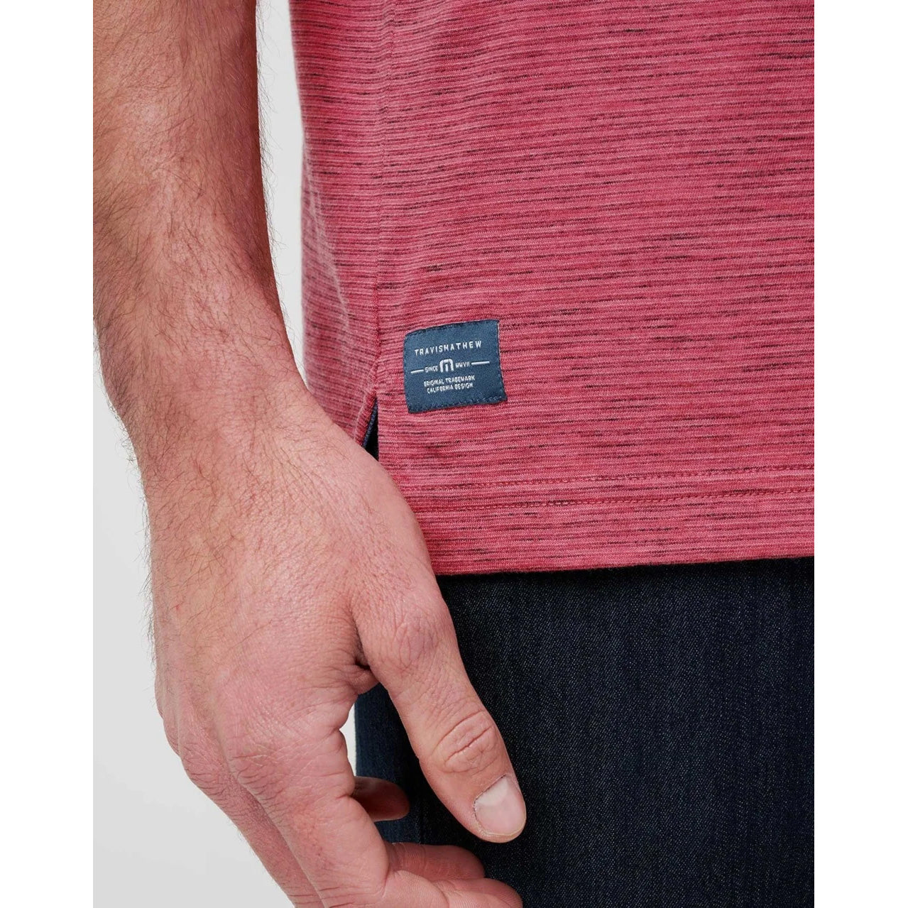 Label tenunan di ujung bawah: memberikan hasil akhir yang bersih dan premium dengan branding Travismathew yang halus.