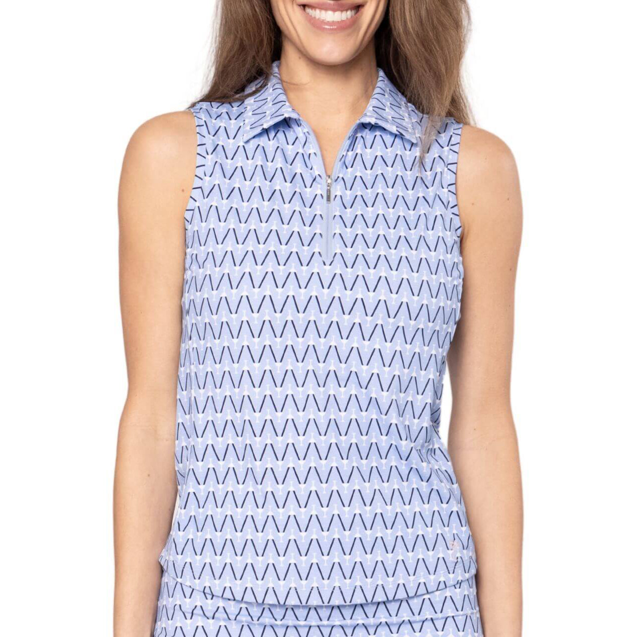 Golftini Women 's Cool Girl Nauti & Nice Sleeveless Sport Polo는 세련된 스타일과 고성능 디자인을 결합합니다. 장난스러운 Seersucker Blue, White 및 Navy Martini Print가 특징 인이 폴로는 라운드 전체에서 시원하고 편안하게 유지하는 가벼운 수분 끓는 직물로 제작되었습니다. 여성 공주 이음새와 1/4 지퍼는 아첨하는 착용감을 제공하는 반면 UPF 30+ 태양 보호 및 주름이없는 성능은 코스에서 맑은 날에 실용적인 선택입니다.