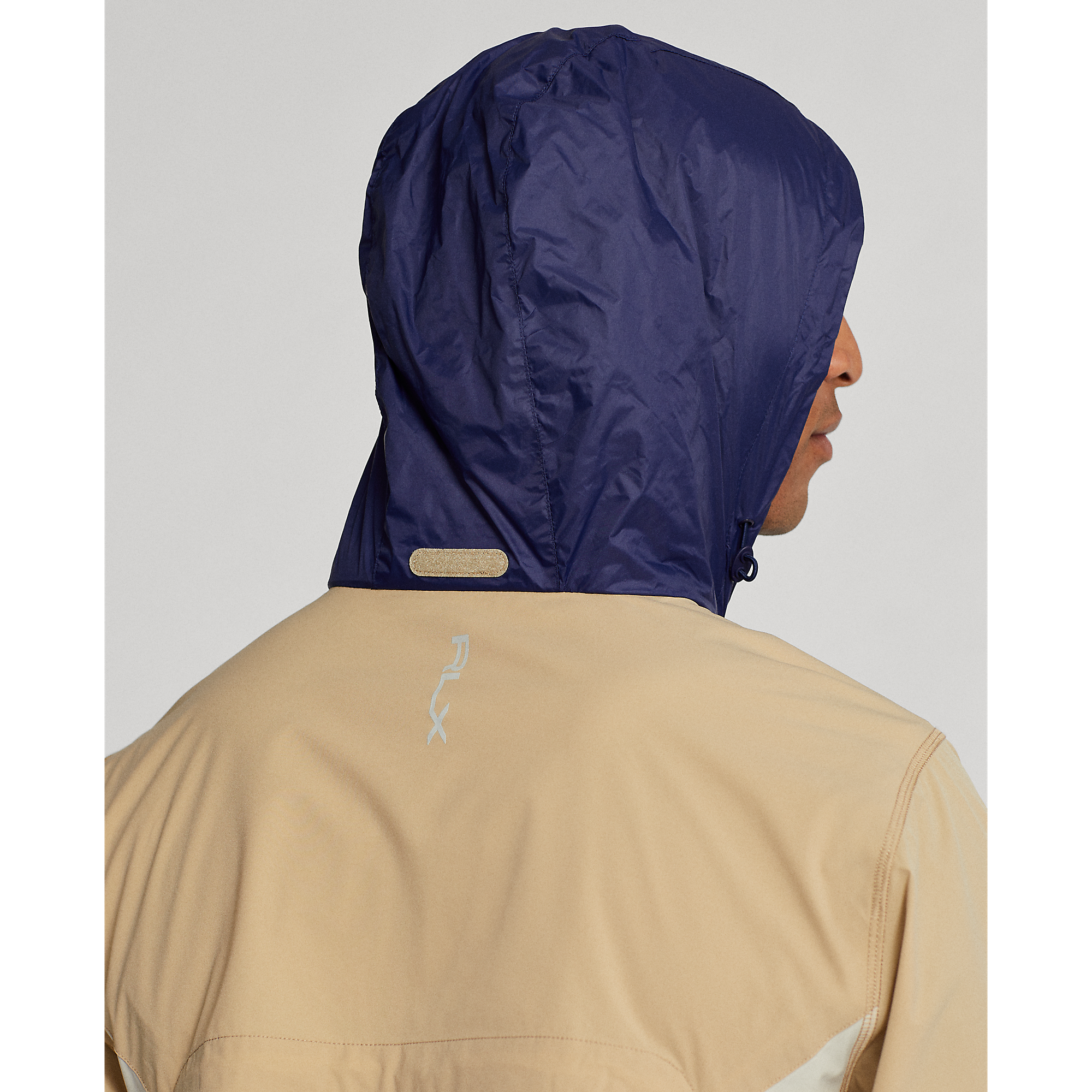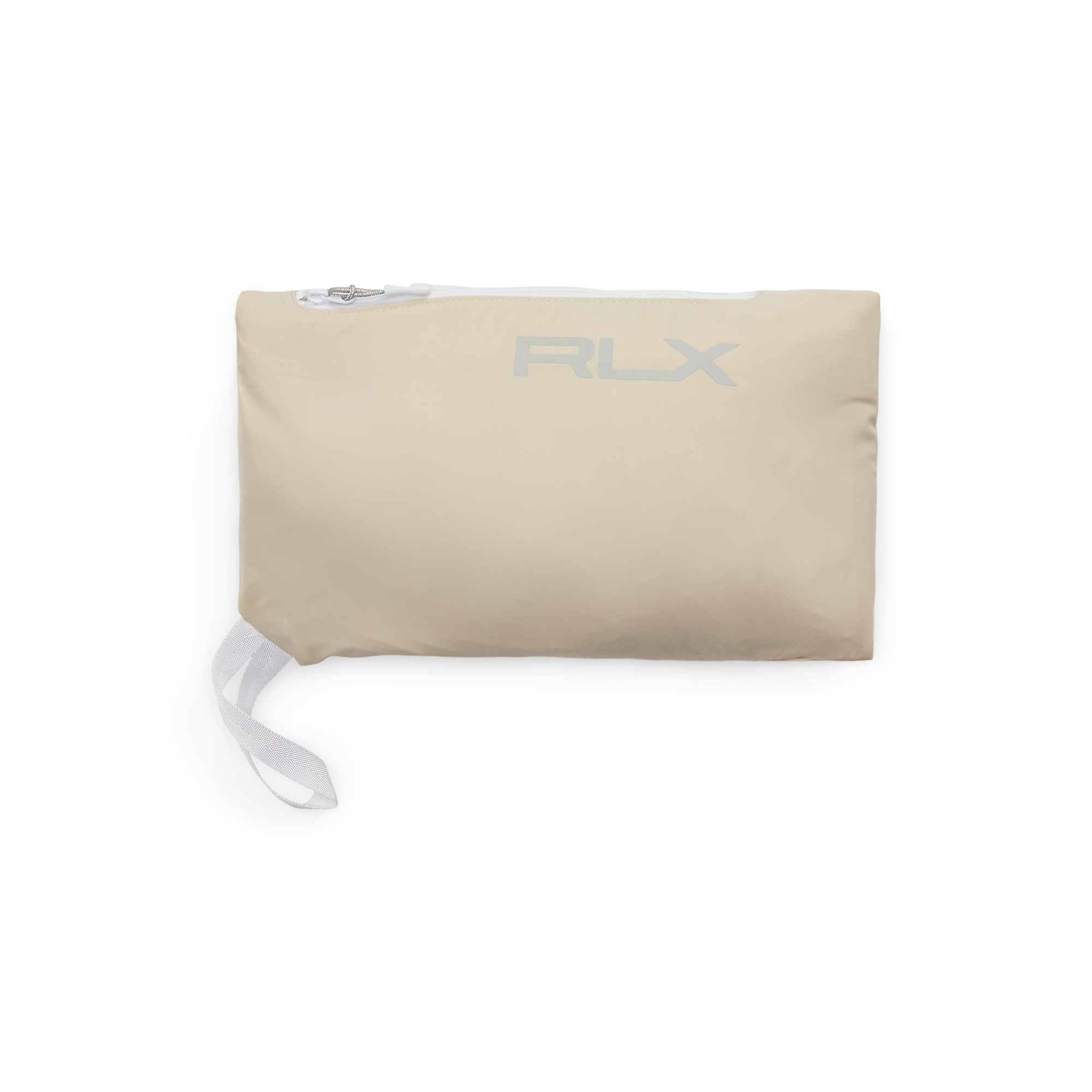 Logo "RLX" dicetak di cuff kanan, kuk belakang, dan beg yang boleh dibungkus.