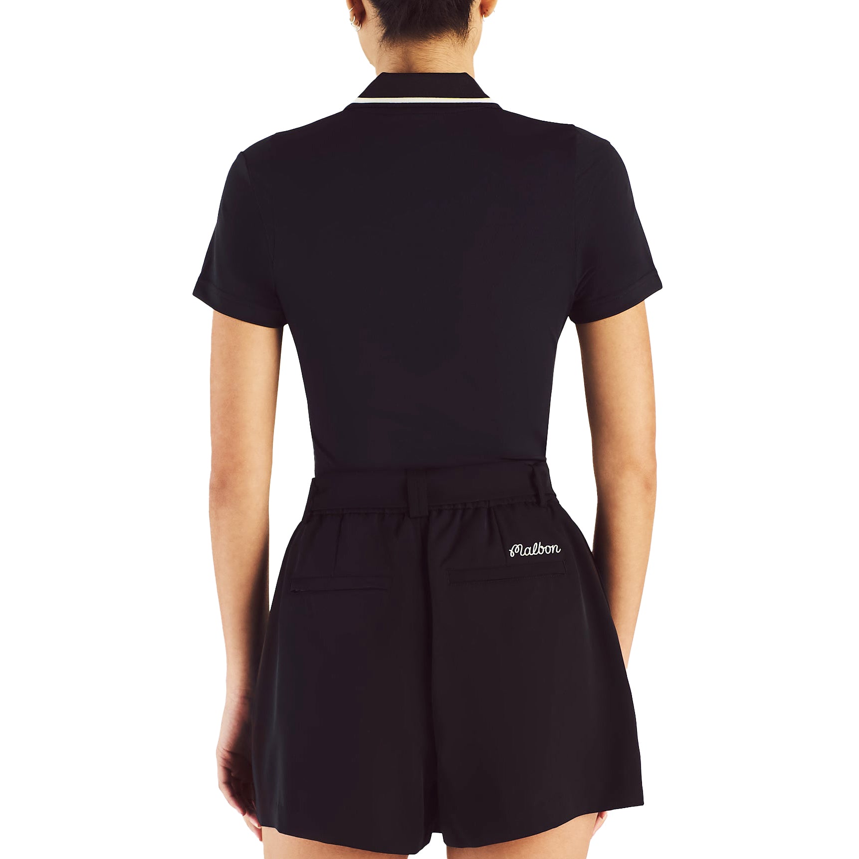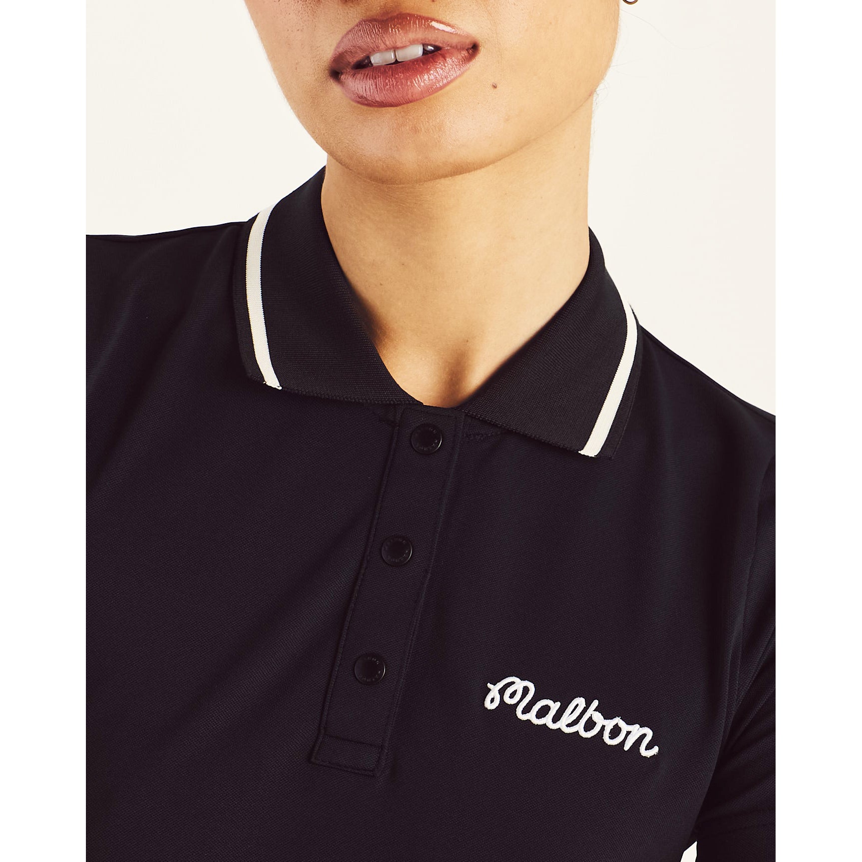 Fabrication: 95% polyester 5% polyurethane Ribbed knit collar with intarsia stripe Embroidered Malbon script logo at left chest Matte snap buttons