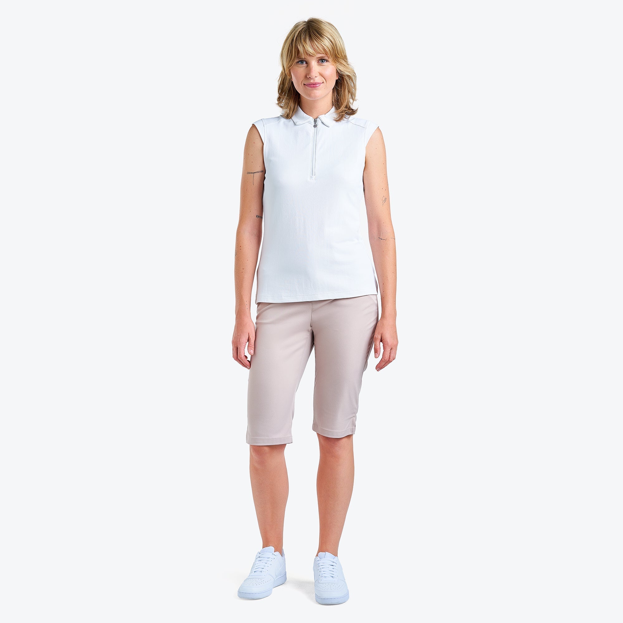 Tillverkad med stretchtyg som rör sig med din sving, erbjuder Vivia Mock varaktig komfort utan att ge avkall på strukturen. Inbyggt UPF 30+ solskydd hjälper till att skydda din hud från skadliga UV-strålar, medan fukttransporterande teknologi drar bort svett för att hålla dig torr och fokuserad under hela din runda. Dess ärmlösa siluett ger obegränsad rörlighet, vilket gör den till ett idealiskt varmt väder.
