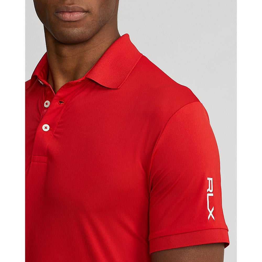 Ribbad polo krage. Tre-knapps packet. Korta ärmar med ribbade armband. Till och med vented hem. "RLX" broderad och tryckt vid höger axel, vänster ärm och baksidan av nacken.